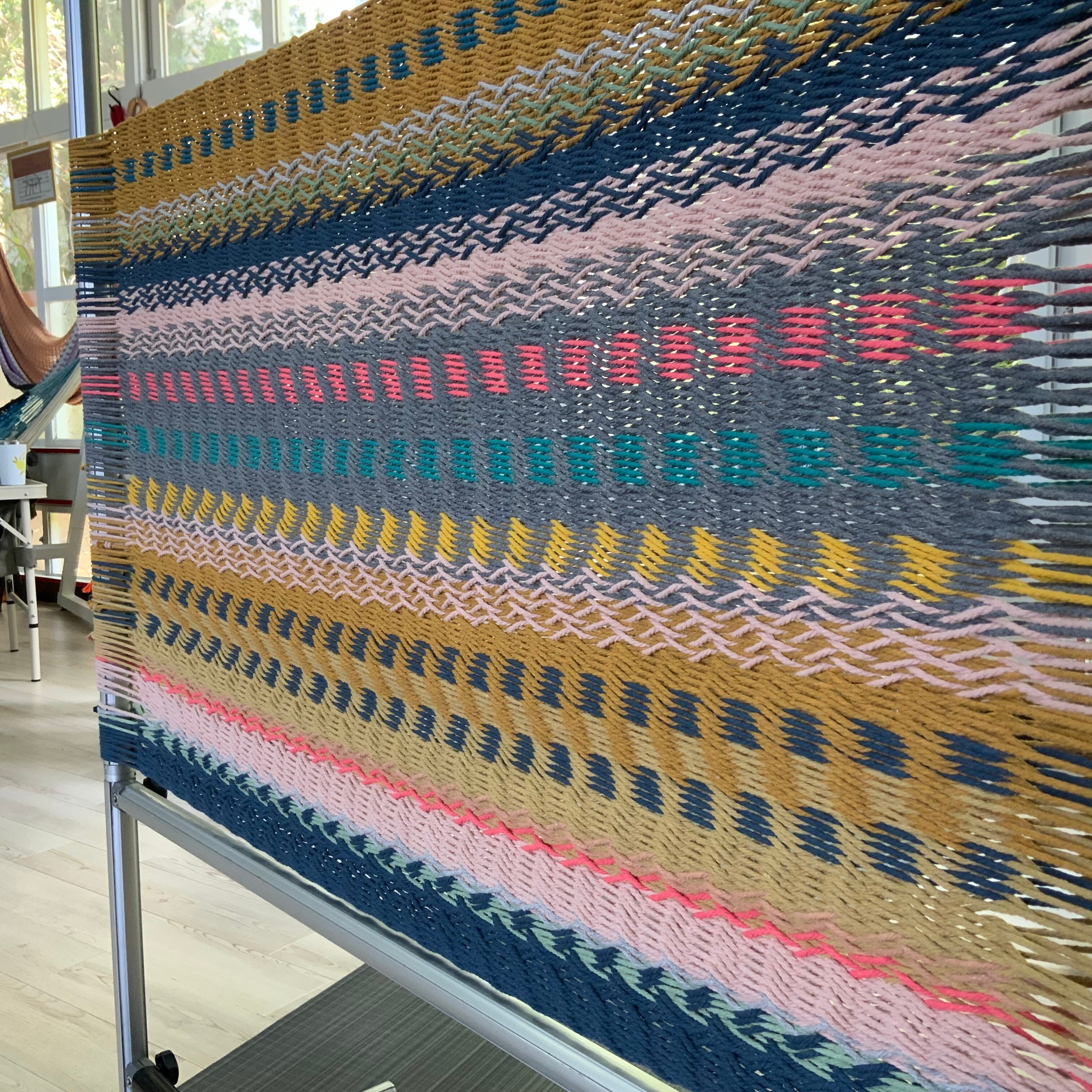 背もたれのついた手編みチェアハンモックです。ゆりかごのような形状で長時間座っていても疲れにくいです。足を伸ばしてストレッチもできる広さがあります。編み目が細かくてコットンの肌触りも優しさに溢れています。読書をしたり映画を見たり好きなようにお寛ぎください。