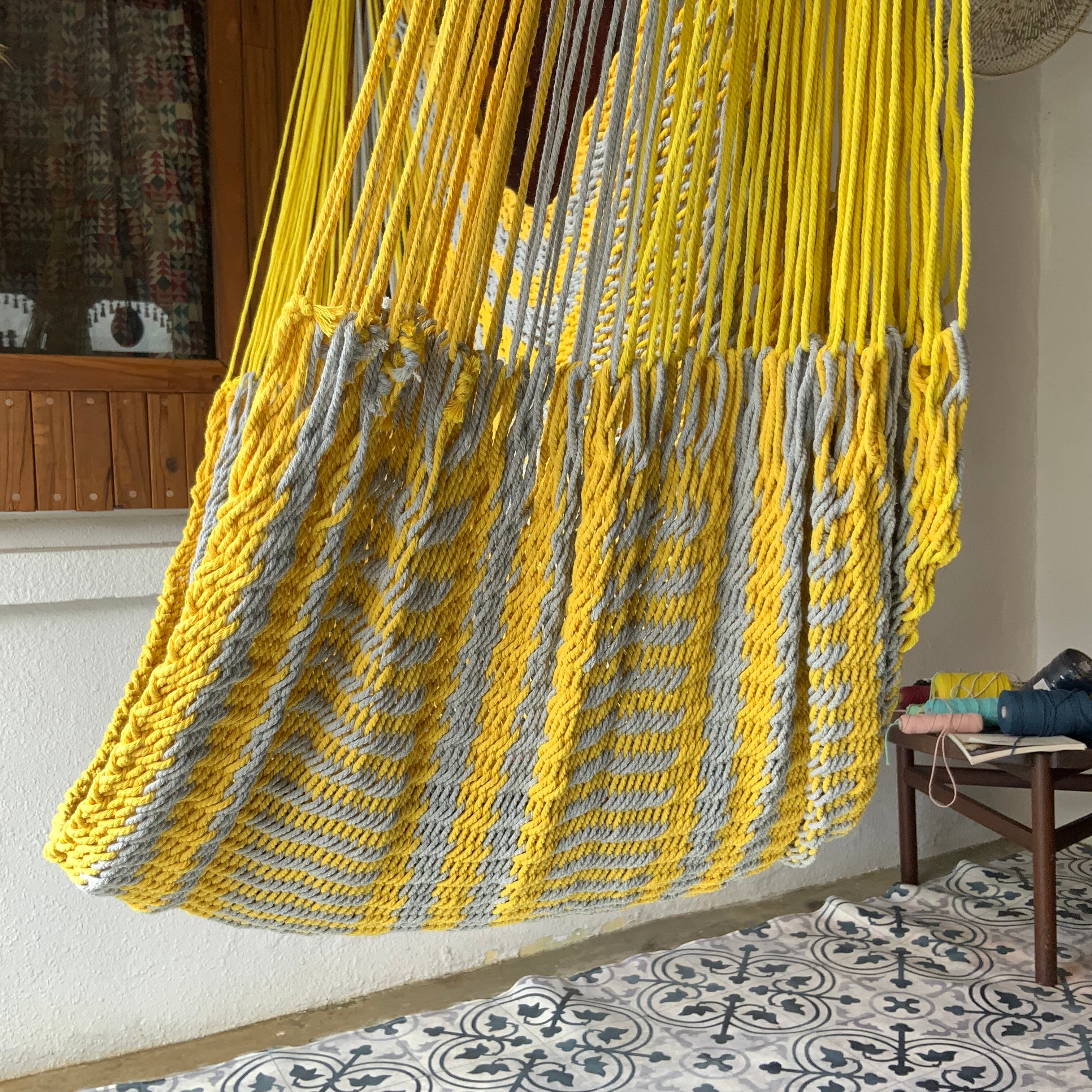 背もたれのついた手編みチェアハンモックです。ゆりかごのような形状で長時間座っていても疲れにくいです。足を伸ばしてストレッチもできる広さがあります。編み目が細かくてコットンの肌触りも優しさに溢れています。読書をしたり映画を見たり好きなようにお寛ぎください。