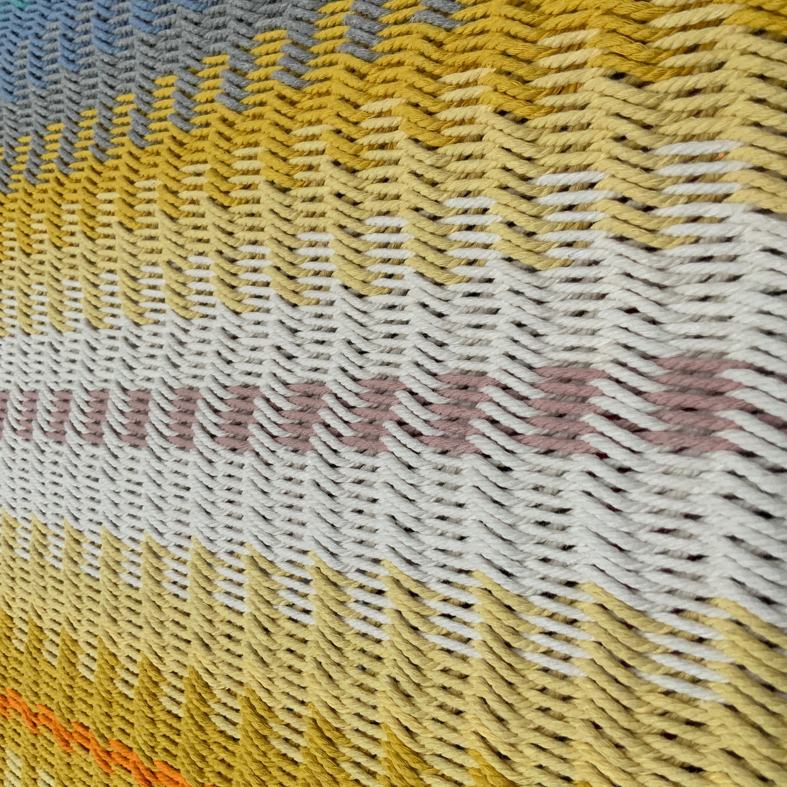 背もたれのついた手編みチェアハンモックです。ゆりかごのような形状で長時間座っていても疲れにくいです。足を伸ばしてストレッチもできる広さがあります。編み目が細かくてコットンの肌触りも優しさに溢れています。読書をしたり映画を見たり好きなようにお寛ぎください。