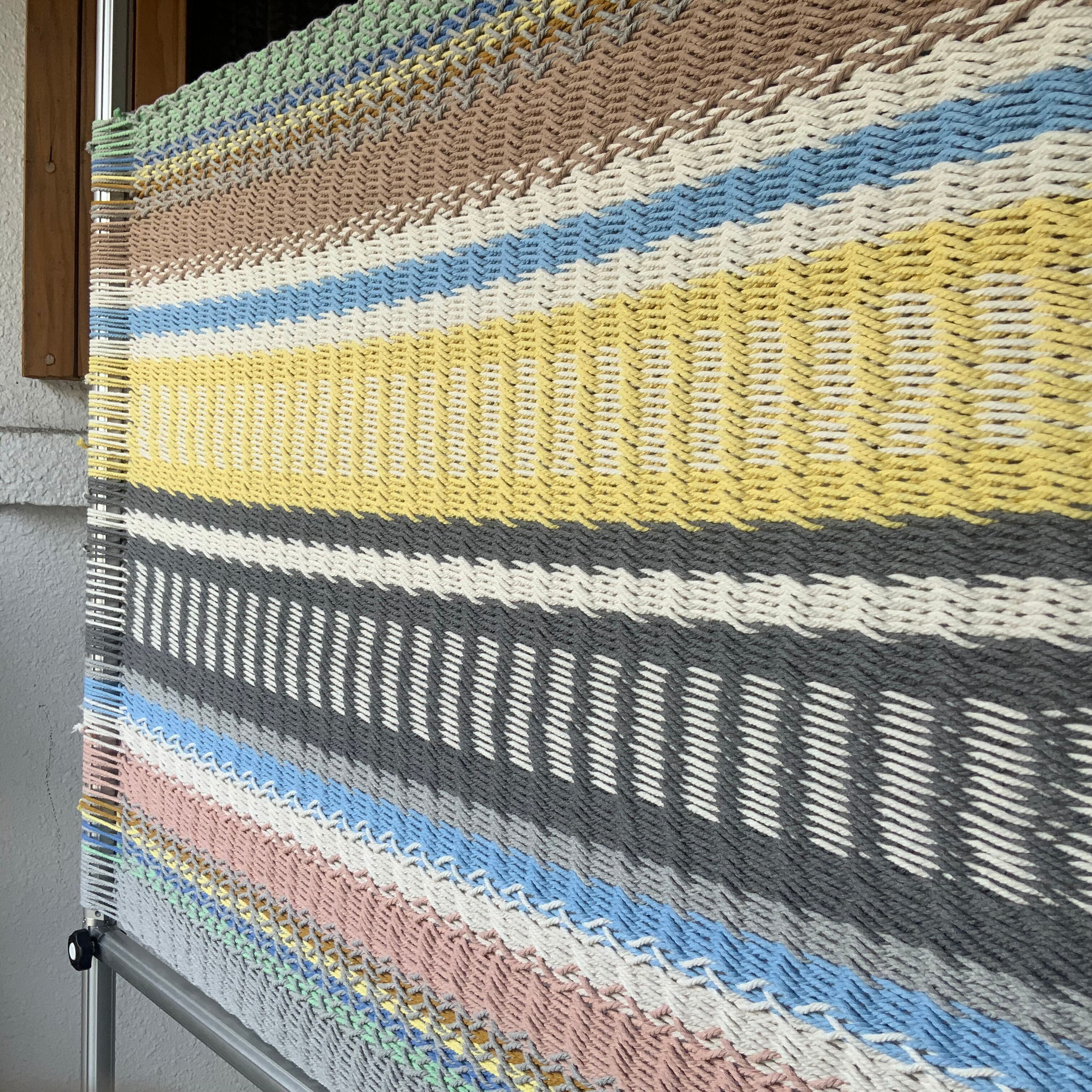 背もたれのついた手編みチェアハンモックです。ゆりかごのような形状で長時間座っていても疲れにくいです。足を伸ばしてストレッチもできる広さがあります。編み目が細かくてコットンの肌触りも優しさに溢れています。読書をしたり映画を見たり好きなようにお寛ぎください。