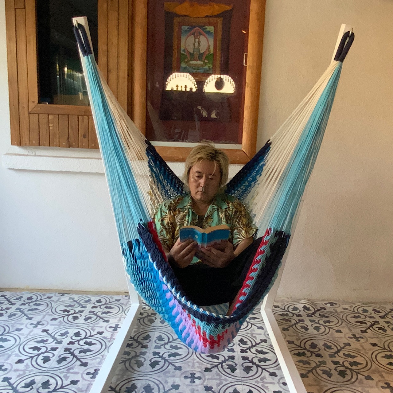 背もたれのついた手編みチェアハンモックです。ゆりかごのような形状で長時間座っていても疲れにくいです。足を伸ばしてストレッチもできる広さがあります。編み目が細かくてコットンの肌触りも優しさに溢れています。読書をしたり映画を見たり好きなようにお寛ぎください。