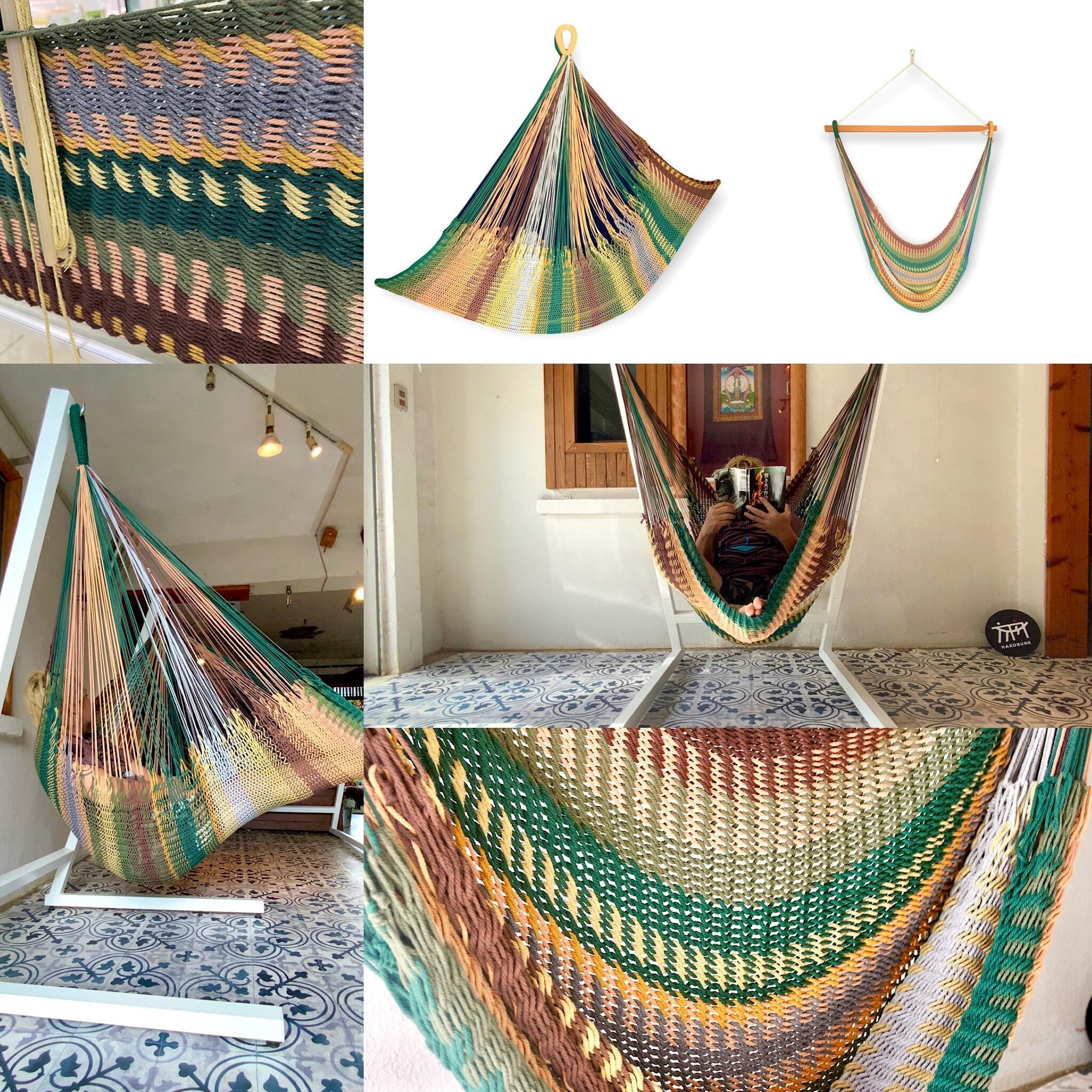 背もたれのついた手編みチェアハンモックです。ゆりかごのような形状で長時間座っていても疲れにくいです。足を伸ばしてストレッチもできる広さがあります。編み目が細かくてコットンの肌触りも優しさに溢れています。読書をしたり映画を見たり好きなようにお寛ぎください。