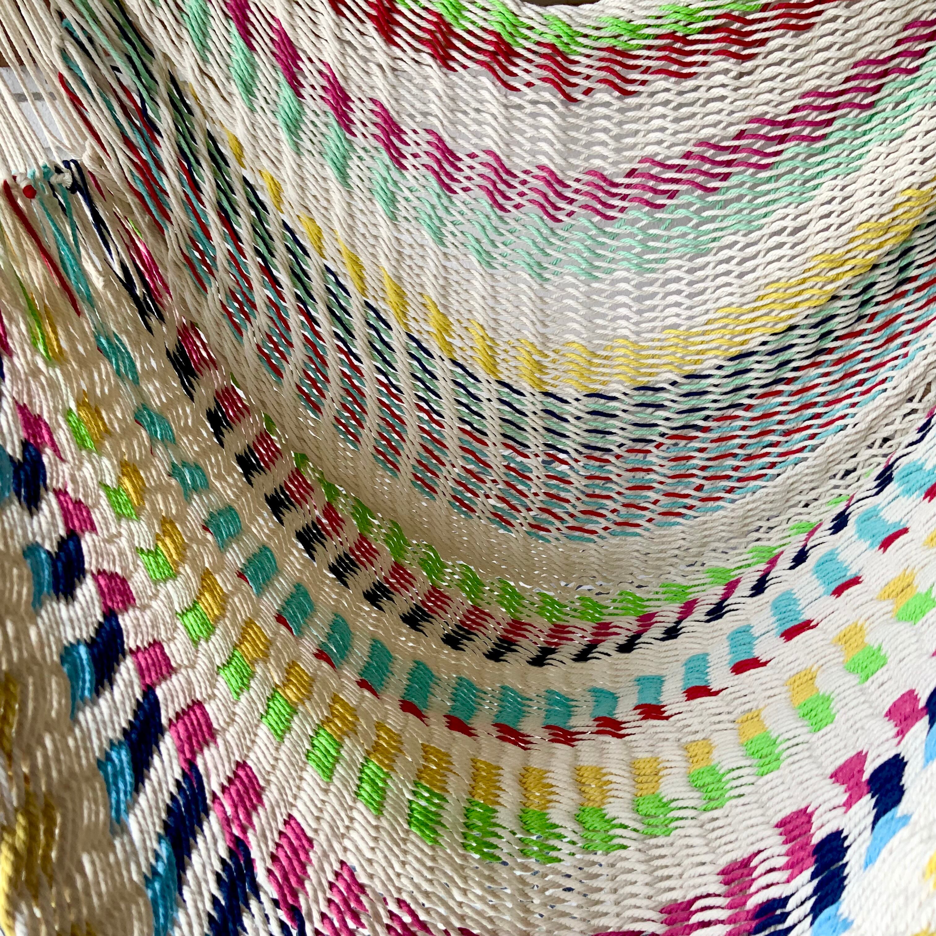 背もたれのついた手編みチェアハンモックです。ゆりかごのような形状で長時間座っていても疲れにくいです。足を伸ばしてストレッチもできる広さがあります。編み目が細かくてコットンの肌触りも優しさに溢れています。読書をしたり映画を見たり好きなようにお寛ぎください。