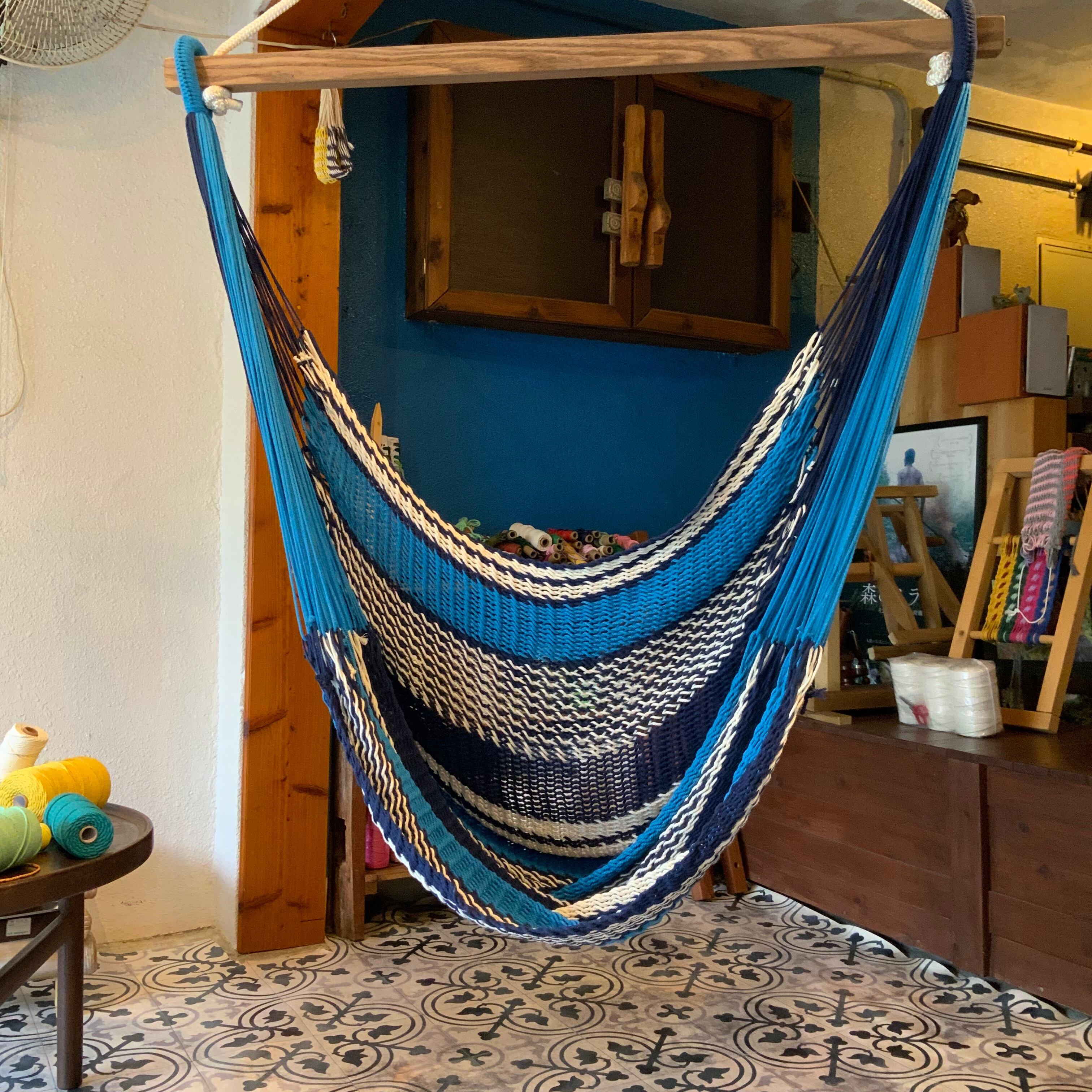 背もたれのついた手編みチェアハンモックです。ゆりかごのような形状で長時間座っていても疲れにくいです。足を伸ばしてストレッチもできる広さがあります。編み目が細かくてコットンの肌触りも優しさに溢れています。読書をしたり映画を見たり好きなようにお寛ぎください。